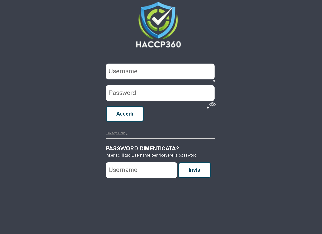 Nel caso aveste smarrito il vostro username vi invitiamo a contattarci tramite mail a info@haccp360.it e rapidamente vi forniremo i dati mancanti.