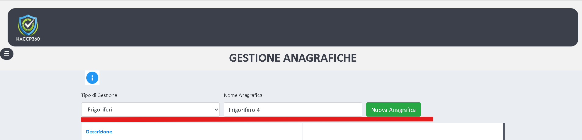 Sarà sufficiente assicurarsi che il primo spazio, vedi immagine sotto, sia settato su “Frigoriferi” (altrimenti settatelo voi tramite il menù a tendina che vedrete lì), inserire il nome che avete scelto per il primo frigo e cliccare sul tasto “Nuova Anagrafica”.